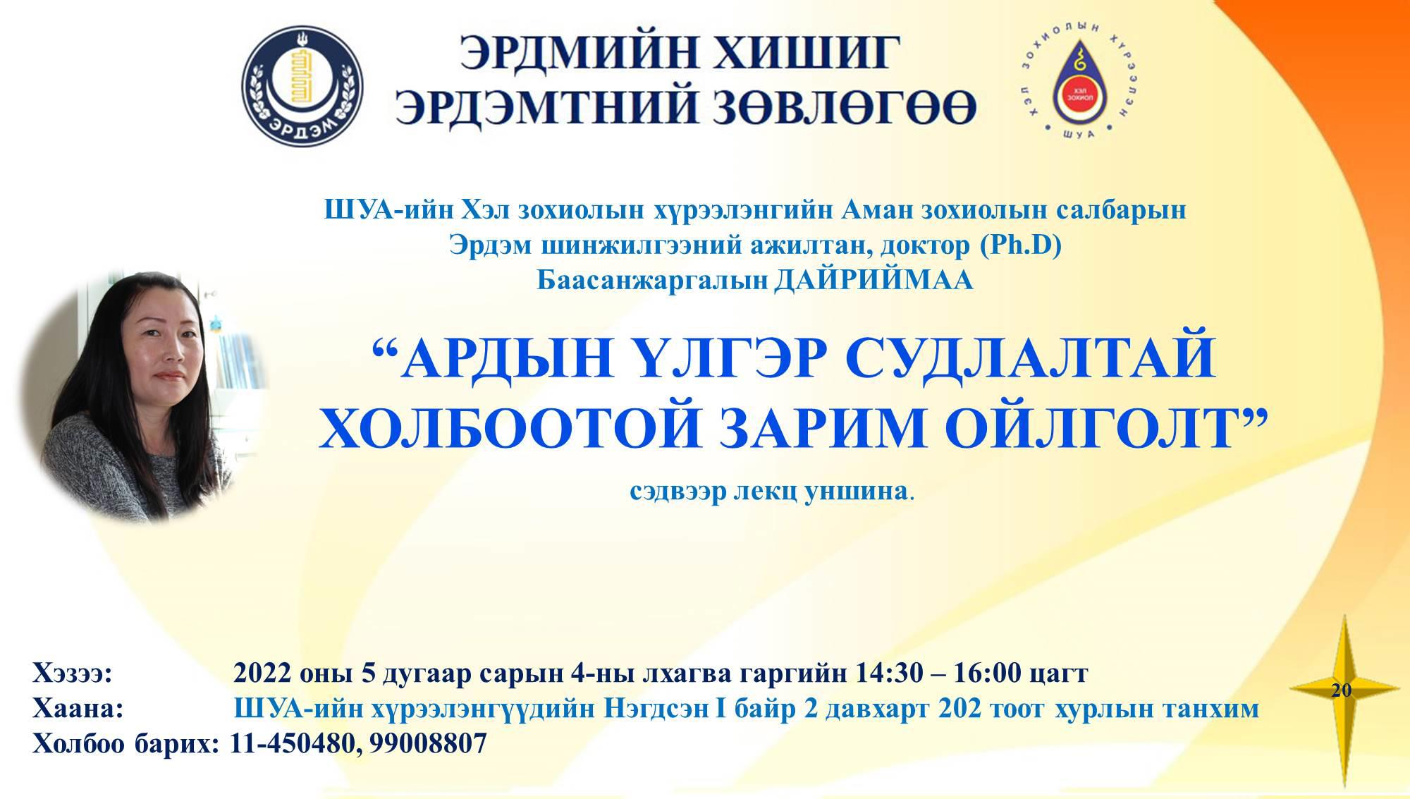 ШУА-ийн Хэл зохиолын хүрээлэнгээс санаачлан, залуу судлаачдын ахисан түвшний тэтгэлэгт хөтөлбөрийн хүрээнд зохион байгуулж буй “Эрдмийн хишиг – Эрдэмтний зөвлөгөө” лекц, ярилцлагын 20 дахь дугаар 2022 оны 5 дугаар сарын 04-ний лхагва гаргийн 14:30-16:00 цагт ШУА-ийн Хэл зохиолын хүрээлэнгийн Номын санд боллоо.