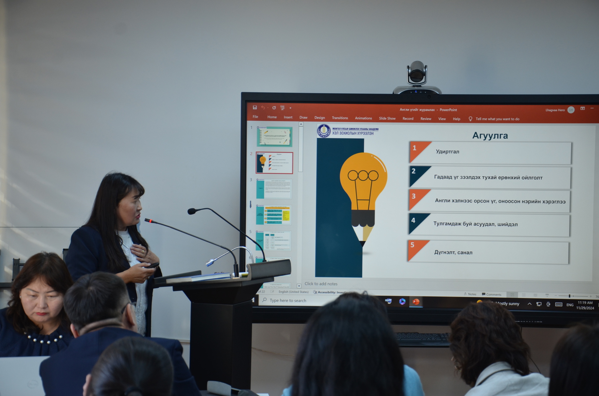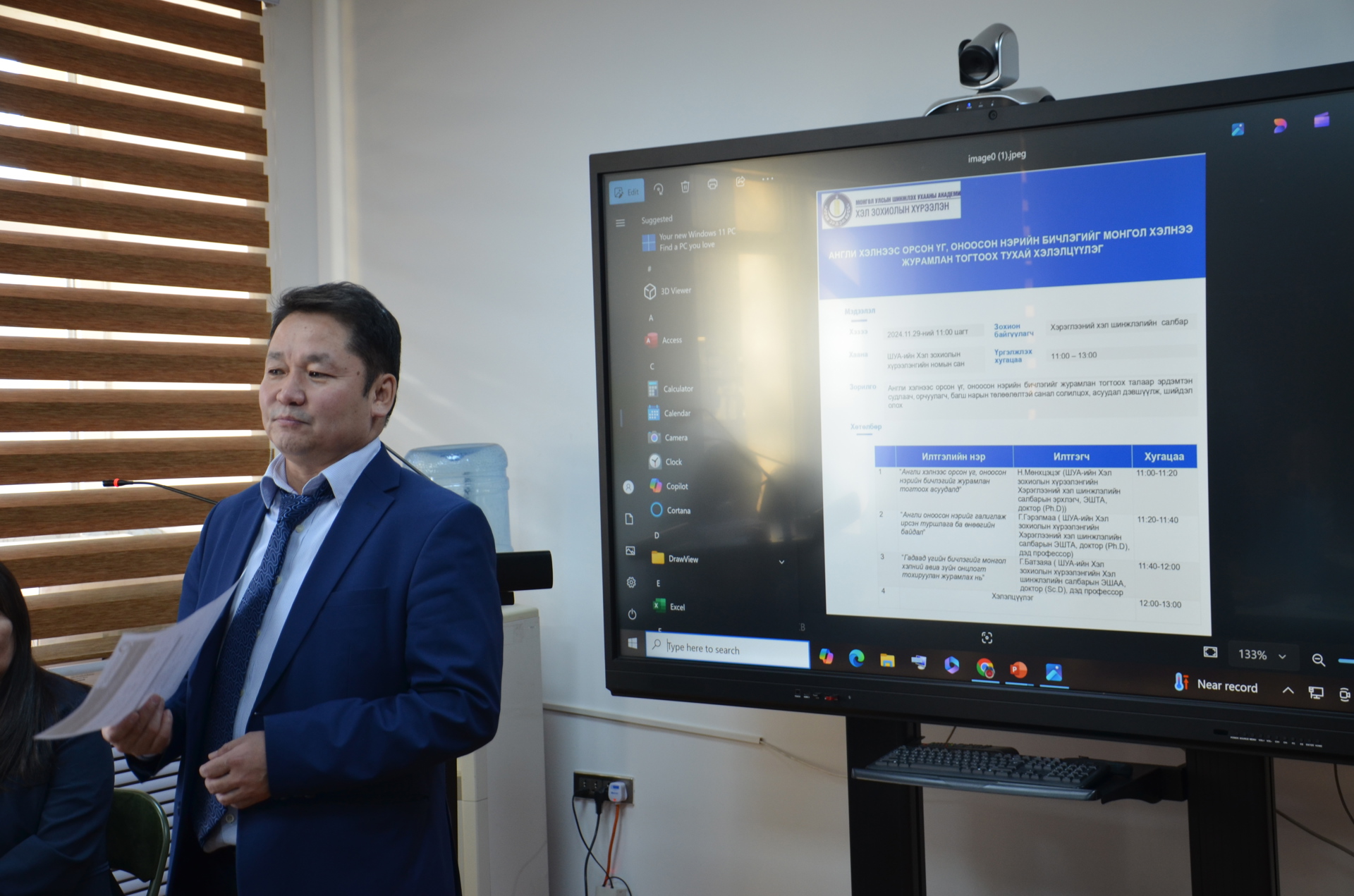 ШУА-ийн Хэл зохиолын хүрээлэнгээс санаачлан 2024 оны 11 сарын 29-ний өдөр ШУА-ийн Хүрээлэнгүүдийн нэгдсэн I байрны номын санд "Англи хэлээс орсон үг, оноосон нэрийн бичлэгийг журамлан тогтоох асуудалд" хэлэлцүүлгийг 2024 оны 11 дүгээр сарын 29-ний өдөр амжилттай зохион байгууллаа. Хэлэлцүүлэгт Хэрэглээний хэл шинжлэлийн салбарын эрхлэгч, ЭШТА, доктор (Ph.D) Н.Мөнхцэцэг “Англи хэлээс орсон үг, оноосон нэрийн бичлэгийг журамлан тогтоох асуудалд” сэдвийн хүрээнд нийгмийн шаардлага, үндэслэл, олон хувилбартай бичлэгийн асуудал, түүнийг хэрхэн шийдвэрлэх, бичлэгийг журамлах тогтолцоотой дүрмийг хэрхэн зохиох талаар; Хэрэглээний хэл шинжлэлийн салбарын ЭШТА, доктор (Ph.D) Г.Гэрэлмаа "Англи оноосон нэрийг бичлэгийг “Англи оноосон нэрийг галиглаж ирсэн туршлага ба өнөөгийн байдал” сэдвийн хүрээнд зарим гадаад газар усны нэр, хүний нэрийг монгол хэлэнд хэрхэн галиглаж ирсэн туршлага, хувилбар бичлэг, түүнийг жигдлэх талаар; Хэл шинжлэлийн салбарын ЭШАА, шинжлэх ухааны доктор (Sc.D) Г.Батзаяа “Гадаад үгийн бичлэгийг монгол хэлний авиа зүйн онцлогт тохируулан журамлах нь” сэдвийн хүрээнд Монгол хэлний зөв бичгийн журамласан толь дахь гадаад үгийг зөв бичих дүрэмд тулгуурлан тодорхой үгсийг жишээлэн авч авиа зүйн талаас хэрхэн журамлах талаар тус тус илтгэл хэлэлцүүллээ.